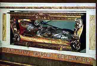 Πρόκειται για άγιο των Καθολικών. Υπήρξε επίσκοπος του Τέρμι της Ιταλίας. Λατρεύεται από τον 4ο αιώνα στη Ρώμη, στο παρεκκλήσι της βασιλικής της Via Flaminia. Θεωρείται προστάτης των επιληπτικών. Μαζί με τον Αγιο Μάριο, πάντρευαν ζευγάρια χριστιανών την εποχή που ο Κλαύδιος το είχε απαγορεύσει γιατί δεν έβρισκε άνδρες για τις εκστρατείες του και πίστευε ότι ο λόγος ήταν πώς οι άνδρες δεν ήθελαν να αφήσουν τις οικογένειές τους και τις αγαπημένες τους. Οι δύο Ιερείς βασανίστηκαν μέχρι θανάτου και από τότε οι καθολικοί αλλά και όλος ο κόσμος γιορτάζουν τον Αγιο Βαλεντίνο (ο Αγιος Μάριος έμεινε στην λήθη)