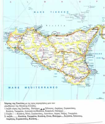 Χάρτης της Σικελίας με τις τρεις περιηγήσεις μου των αξιοθέατων της Μεγάλης Ελλάδας