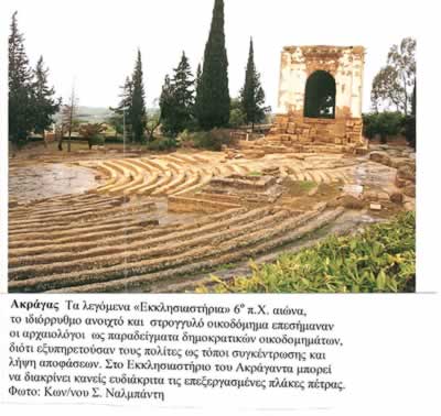 Ακράγας Τα λεγόμενα «Εκκλησιαστήρια» 6ο π.Χ. αιώνα, το ιδιόρρυθμο ανοιχτό και στρογγυλό οικοδόμημα επεσήμαναν οι αρχαιολόγοι ως παραδείγματα δημοκρατικών οικοδομημάτων, διότι εξυπηρετούσαν τους πολίτες ως τόποι συγκέντρωσης και λήψη αποφάσεων. Στο Εκκλησιαστήριο του Ακράγαντα μπορεί να διακρίνει κανείς ευδιάκριτα τις επεξεργασμένες πλάκες πέτρας. Φωτο: Κων/νου Σ. Ναλμπάντη