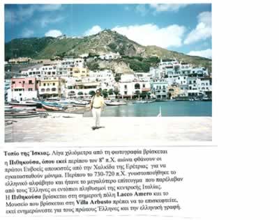 Τοπίο της Ίσκιας. Λίγα χιλιόμετρα από τη φωτογραφία βρίσκεται η Πιθηκούσα, όπου εκεί περίπου τον 8ο π.Χ. αιώνα φθάνουν οι πρώτοι Ευβοείς αποικιστές από την Χαλκίδα της Ερέτριας για να εγκατασταθούν μόνιμα. Περίπου το 730-720 π.Χ. γνωστοποιήθηκε το ελληνικό αλφάβητο και ήτανε το μεγαλύτερο επίτευγμα που παρέλαβαν από τους Έλληνες οι εντόπιοι πληθυσμοί της κεντρικής Ιταλίας. Η Πιθηκούσα βρίσκεται στη σημερινή πόλη Lacco Amero και το Μουσείο που βρίσκεται στη Villa Arbusto πρέπει να το επισκεφτείτε, εκεί ενημερώνεστε για τους πρώτους Έλληνες και την ελληνική γραφή.