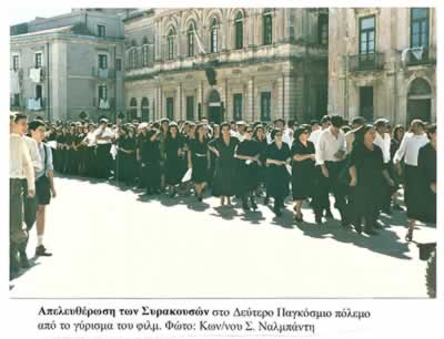 σκεπτόμενος τη σκηνή εκείνης της αδικαιολόγητης μάχης μεταξύ των Αθηναίων και Συρακούσιων το έτος 413 π.Χ.. Κυρίως τις απογευματινές ώρες είναι ο πιο αγαπημένος περίπατος διαμέσου της λεωφόρου που οδηγεί κατ΄ ευθείαν στη ειδυλλιακή ιστορική πηγή της Αρέθουσας. Απελευθέρωση των Συρακουσών στο Δεύτερο Παγκόσμιο πόλεμο από το γύρισμα του φιλμ. Φώτο: Κων/νου Σ. Ναλμπάντη