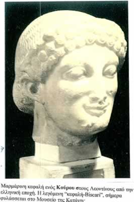 Μαρμάρινη κεφαλή ενός Κούρου στους Λεοντίνους από την ελληνική εποχή. Η λεγόμενη “κεφαλή-Biscari”, σήμερα φυλάσσεται στο Μουσείο της Κατάνης.