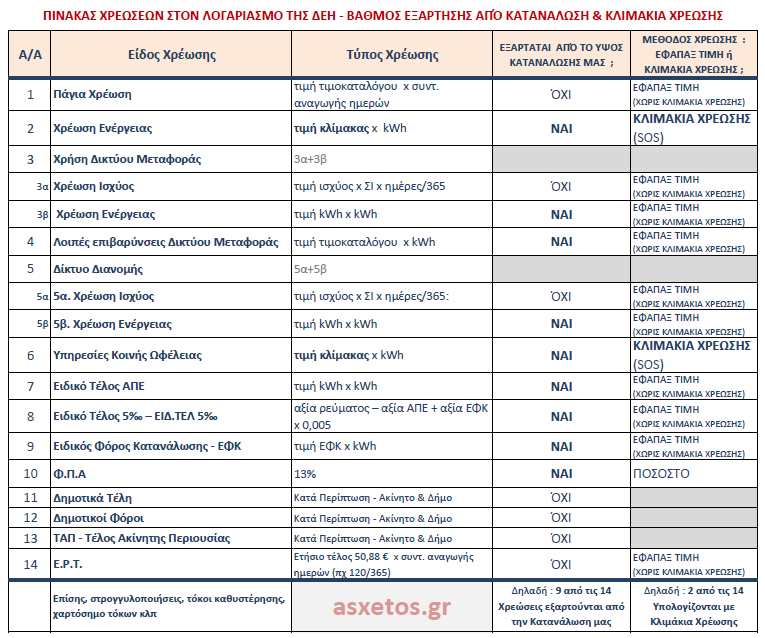 Οπως θα διαβάσετε στον Πίνακα που ακολουθεί, οι 9 από τις 14 κύριες χρεώσεις του Λογαριασμού της ΔΕΗ εξαρτούνται από το ύψος της κατανάλωσης μας, δηλαδή όσο πιο πολλές kwh (κιλοβατώρες) καταναλώνουμε τόσο πιο πολλά πληρώνουμε. Τις 10 χρεώσεις θα τις βρείτε στην πρώτη σελίδα του λογαριασμού σας, τις υπόλοιπες 5 στην 2η σελίδα (υπέρ Δήμου και ΕΡΤ).