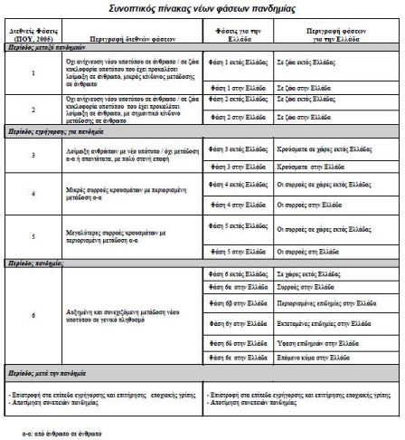 Η περαιτέρω διάκριση της φάσεως 6 για τη χώρα µας αφορά την εµφάνιση της πανδηµίας σε χώρες εκτός Ελλάδας ή στην Ελλάδα, καθώς και την εµφάνιση δεύτερου κύµατος µετά από την ύφεση του πρώτου κύµατος.
