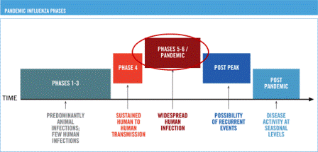 • Φάση 5: Μεγαλύτερες συρροές κρουσµάτων γρίπης από το νέο υπότυπο µε περιορισµένη ακόµη µετάδοση από άνθρωπο σε άνθρωπο, γεγονός που υποδεικνύει ότι ο ιός αρχίζει να προσαρµόζεται περισσότερο στον ανθρώπινο οργανισµό.
