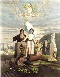 Ἐδῶ συκώνονται οἱ πατριῶται ὀρθοί, καὶ ὑψώνοντες τὰς χεῖρας πρὸς τὸν οὐρανόν, / κάμνουν τὸν ὅρκον.