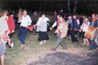 SLIDE No 5. Here we can see the start of the march of the firewalkers and many onlookers from Archianastenaris home to the village square, at about 2 hours after setting fire to the cord woods. Please note that this march is enacted to the accompaniment of music by a drum and a lyra player, and the chief actors are leading the procession dancing, while their whole appearance gives the impression that these persons are in a state of trance.