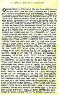 1. ΟΜΝΥΜΙ ΑΠΟΛΛΩΝΑ ΙΗΤΡΟΝ ΚΑΙ ΑΣΚΛΗΠΙΟΝ ΚΑΙ ΥΓΕΙΑΝ ΚΑΙ ΠΑΝΑΚΕΙΑΝ ΚΑΙ ΘΕΟΥΣ ΠΑΝΤΑΣ ΤΕ ΚΑΙ ΠΑΣΑΣ ΙΣΤΟΡΑΣ ΠΟΙΟΥΜΕΝΟΣ , ΕΠΙΤΕΛΕΑ ΠΟΙΗΣΕΙΝ ΚΑΤΑ ΔΥΝΑΜΙΝ ΚΑΙ ΚΡΙΣΙΝ ΕΜΗΝ ΟΡΚΟΝ ΤΟΝΔΕ.
